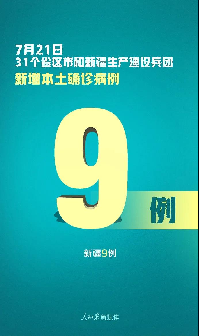 7月21日0—24時,31個省(自治區、直轄市)和新疆生產建設兵團報告新增確診病例14例,其中境外輸入病例5例(上海2例,廣東2例,云南1例),本土病例9例(均在新疆);無新增死亡病例;無新增疑似病例。