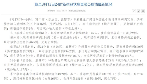 人民網北京8月14日電(董童)國家衛生健康委于今日在官網發布的《截至8月13日24時新型冠狀病毒肺炎疫情最新情況》(以下簡稱“情況”)提出,8月13日0—24時,31個省(自治區、直轄市)和新疆生產建設兵團報告新增確診病例30例,其中境外輸入病例22例(上海16例,陜西5例,四川1例),本土病例8例(均在新疆);無新增死亡病例;新增疑似病例2例,均為境外輸入病例(均在上海)。當日新增治愈出院病例64例,解除醫學觀察的密切接觸者1567人,重癥病例較前一日減少2例。