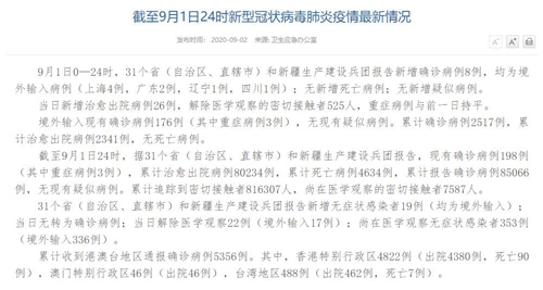 截至9月1日24時,據31個省(自治區、直轄市)和新疆生產建設兵團報告,現有確診病例198例(其中重癥病例3例),累計治愈出院病例80234例,累計死亡病例4634例,累計報告確診病例85066例,無現有疑似病例。累計追蹤到密切接觸者816307人,尚在醫學觀察的密切接觸者7587人。