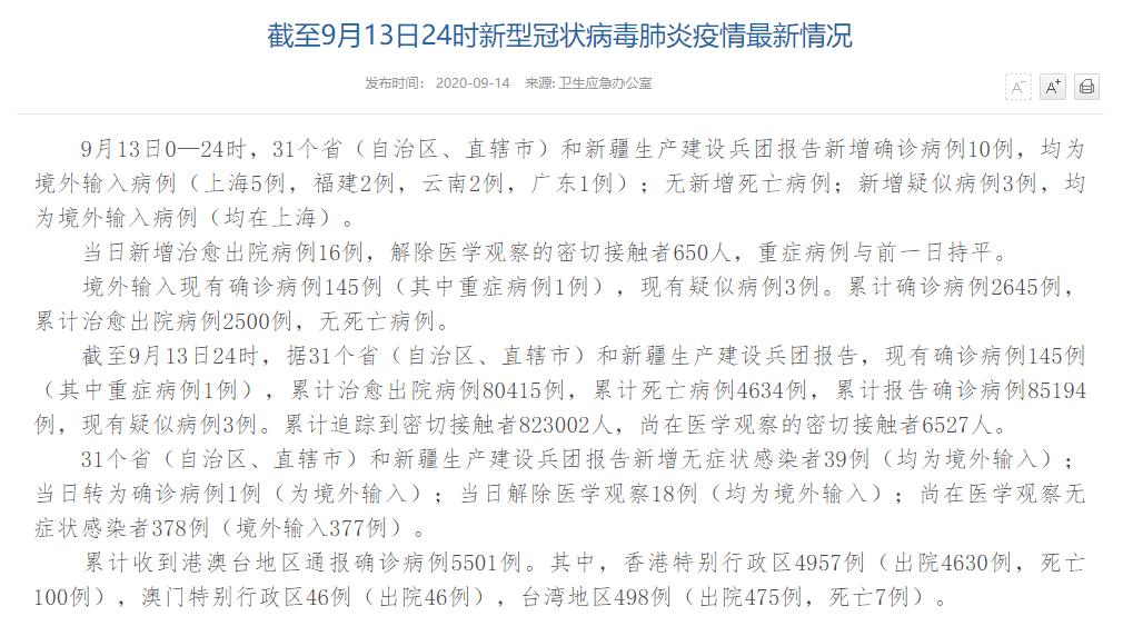 人民網(wǎng)北京9月14日(董童)國家衛(wèi)生健康委于今日在官網(wǎng)發(fā)布的《截至9月13日24時(shí)新型冠狀病毒肺炎疫情最新情況》(以下簡稱“情況”)提出,9月13日0—24時(shí),31個(gè)省(自治區(qū)、直轄市)和新疆生產(chǎn)建設(shè)兵團(tuán)報(bào)告新增確診病例10例,均為境外輸入病例(上海5例,福建2例,云南2例,廣東1例);無新增死亡病例;新增疑似病例3例,均為境外輸入病例(均在上海)。當(dāng)日新增治愈出院病例16例,解除醫(yī)學(xué)觀察的密切接觸者650人,重癥病例與前一日持平。