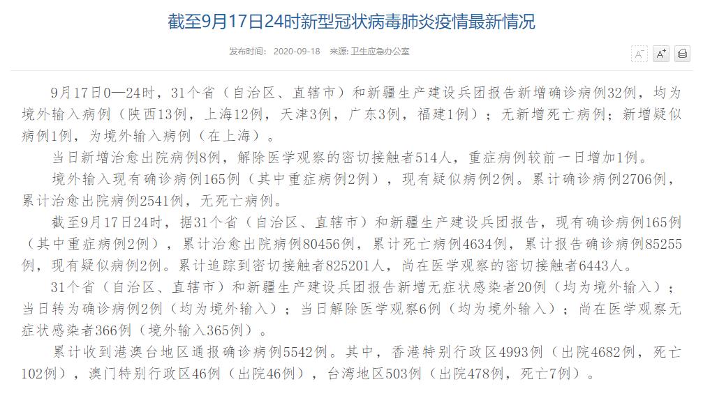 人民網北京9月18日電(董童)國家衛生健康委于今日在官網發布的《截至9月17日24時新型冠狀病毒肺炎疫情最新情況》(以下簡稱“情況”)提出,9月17日0—24時,31個省(自治區、直轄市)和新疆生產建設兵團報告新增確診病例32例,均為境外輸入病例(陜西13例,上海12例,天津3例,廣東3例,福建1例);無新增死亡病例;新增疑似病例1例,為境外輸入病例(在上海)。當日新增治愈出院病例8例,解除醫學觀察的密切接觸者514人,重癥病例較前一日增加1例。