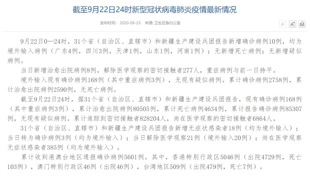 人民網北京9月23日電(董童)國家衛生健康委于今日在官網發布的《截至9月22日24時新型冠狀病毒肺炎疫情最新情況》(以下簡稱“情況”)提出,9月22日0—24時,31個省(自治區、直轄市)和新疆生產建設兵團報告新增確診病例10例,均為境外輸入病例(廣東4例,四川3例,天津1例,山東1例,河南1例);無新增死亡病例;無新增疑似病例。當日新增治愈出院病例8例,解除醫學觀察的密切接觸者277人,重癥病例與前一日持平。