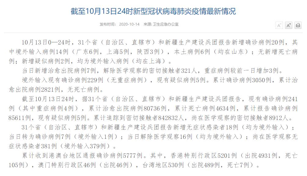人民網北京10月14日電(董童)國家衛生健康委于今日在官網發布的《截至10月13日24時新型冠狀病毒肺炎疫情最新情況》(以下簡稱“情況”)稱,10月13日0—24時,31個?。ㄗ灾螀^、直轄市)和新疆生產建設兵團報告新增確診病例20例,其中境外輸入病例14例(廣東6例,上海5例,陜西3例),本土病例6例(均在山東);無新增死亡病例;新增疑似病例2例,均為境外輸入病例(均在上海)。當日新增治愈出院病例7例,解除醫學觀察的密切接觸者321人,重癥病例較前一日增加3例。