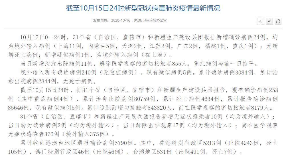 | 國家衛健委:10月15日新增確診病例24例 均為境外輸入病例 |