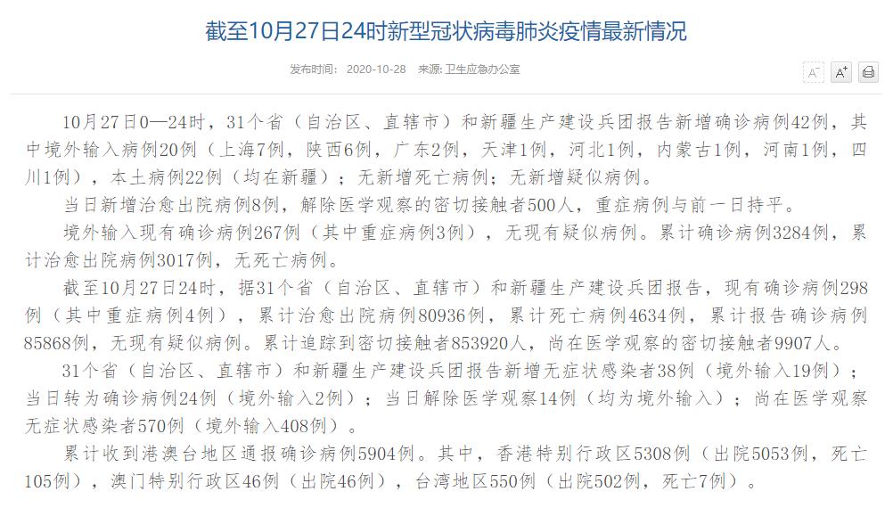 人民網(wǎng)北京10月28日電(董童)國(guó)家衛(wèi)生健康委于今日在官網(wǎng)發(fā)布的《截至10月27日24時(shí)新型冠狀病毒肺炎疫情最新情況》(以下簡(jiǎn)稱“情況”)提出,10月27日0—24時(shí),31個(gè)省(自治區(qū)、直轄市)和新疆生產(chǎn)建設(shè)兵團(tuán)報(bào)告新增確診病例42例,其中境外輸入病例20例(上海7例,陜西6例,廣東2例,天津1例,河北1例,內(nèi)蒙古1例,河南1例,四川1例),本土病例22例(均在新疆);無(wú)新增死亡病例;無(wú)新增疑似病例。當(dāng)日新增治愈出院病例8例,解除醫(yī)學(xué)觀察的密切接觸者500人,重癥病例與前一日持平。
