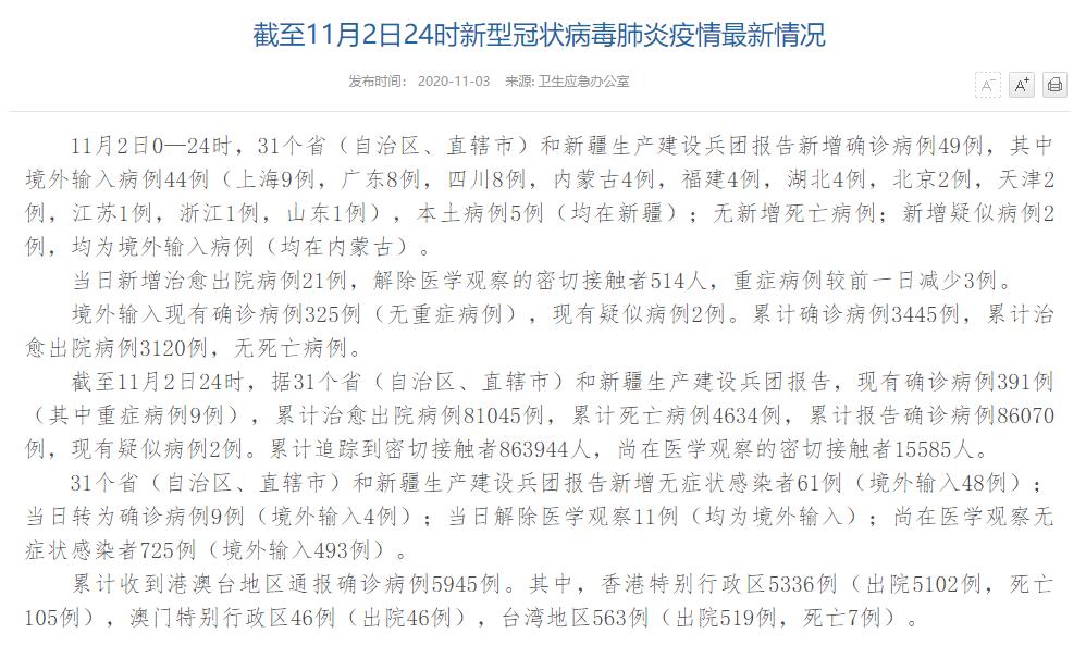 人民網北京11月3日電(董童)國家衛生健康委于今日在官網發布的《截至11月2日24時新型冠狀病毒肺炎疫情最新情況》(以下簡稱“情況”)指出,11月2日0—24時,31個省(自治區、直轄市)和新疆生產建設兵團報告新增確診病例49例,其中境外輸入病例44例(上海9例,廣東8例,四川8例,內蒙古4例,福建4例,湖北4例,北京2例,天津2例,江蘇1例,浙江1例,山東1例),本土病例5例(均在新疆);無新增死亡病例;新增疑似病例2例,均為境外輸入病例(均在內蒙古)。當日新增治愈出院病例21例,解除醫學觀察的密切接觸者514人,重癥病例較前一日減少3例。