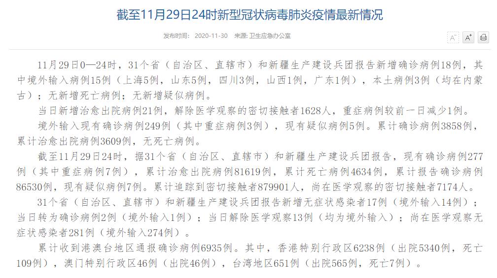 人民網北京11月30日電(董童)國家衛生健康委于今日在官網發布的《截至11月29日24時新型冠狀病毒肺炎疫情最新情況》(以下簡稱“情況”)指出,11月29日0—24時,31個?。ㄗ灾螀^、直轄市)和新疆生產建設兵團報告新增確診病例18例,其中境外輸入病例15例(上海5例,山東5例,四川3例,山西1例,廣東1例),本土病例3例(均在內蒙古);無新增死亡病例;無新增疑似病例。當日新增治愈出院病例21例,解除醫學觀察的密切接觸者1628人,重癥病例較前一日減少1例。