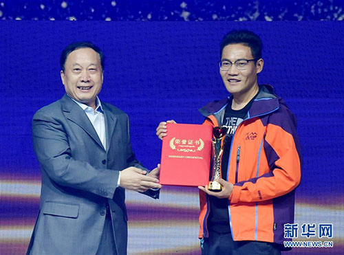 1月18日,“環保衛士”次仁旦達(右)上臺領獎。 當日,新華社主辦的“中國網事·感動2018”年度頒獎典禮在中國傳媒大學舉行,10位“草根”成為舞臺上最閃亮的明星。新華社記者 李賀 攝