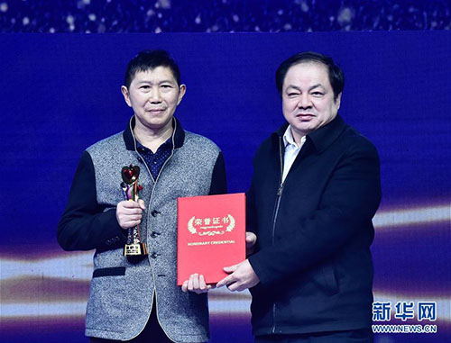 1月18日,“粉筆畫老師”張舉文(左)上臺領獎。當日,新華社主辦的“中國網事·感動2018”年度頒獎典禮在中國傳媒大學舉行,10位“草根”成為舞臺上最閃亮的明星。新華社記者 李賀 攝