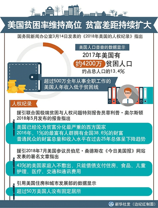 國務院新聞辦公室14日發表《2018年美國的人權紀錄》《2018年美國侵犯人權事記》,對美國侵犯人權的狀況進行揭露。