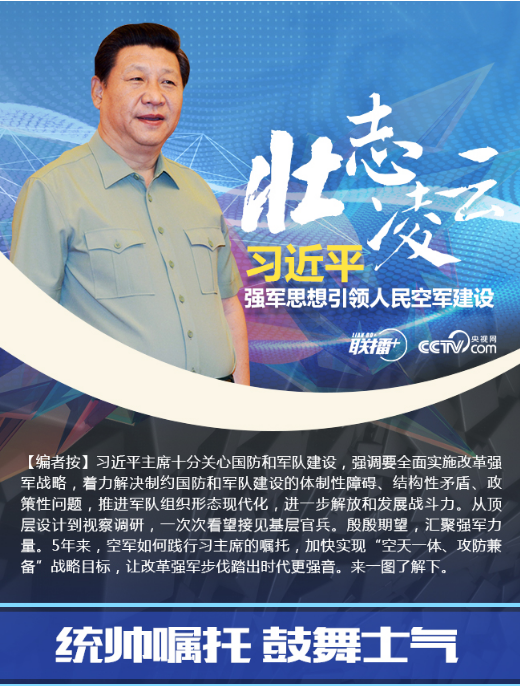 【聯播+】5年前的4月14日,中共中央總書記、國家主席、中央軍委主席習近平專程到空軍機關調研空軍建設和軍事斗爭準備,代表黨中央、中央軍委向空軍全體官兵致以誠摯的問候,強調要加快建設一支空天一體、攻防兼備的強大人民空軍,為實現中國夢、強軍夢提供堅強力量支撐。