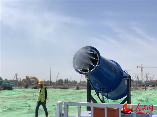 環(huán)保除塵霧炮機在施工現(xiàn)場作業(yè)。人民網5月7日攝