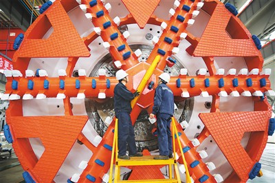 今年以來,濟南重工集團有限公司打造以軌道交通裝備產業為核心的智能制造與高端裝備產業園,重點發展全斷面隧道掘進機、隧道掘進專用裝備、裝配式建材生產線等產品領域,老國企煥發出勃勃生機。圖為工人在查看即將完工的盾構機刀盤。
