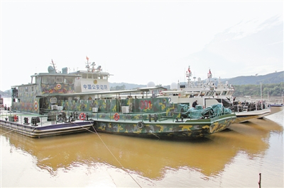 在湄公河“金三角”水域巡邏的中老緬泰湄公河聯(lián)合巡邏執(zhí)法編隊(duì)。本報(bào)記者 孫廣勇攝