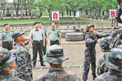 學院訓練場上,學員們生龍活虎、喊聲震天,一派實戰(zhàn)化練兵景象。習近平走到障礙訓練場旁,察看學員進行障礙訓練情況。極限訓練對于錘煉學員體能極限、意志極限、心理極限,提高戰(zhàn)場適應能力很有意義。習近平步行進入極限訓練場,詳細了解有關訓練設施和訓練情況。學員們進行了阻絕墻跳水、翻越懶人梯、跨越步步高、翻越高墻、攀爬云梯、攀越高空蕩木橋、扛圓木等訓練??吹綄W員們摸爬滾打一身泥水,迎著障礙一往無前,習近平很高興。