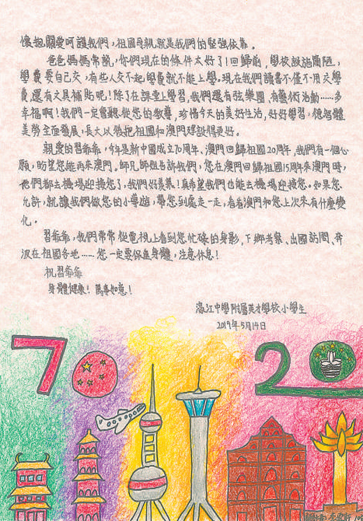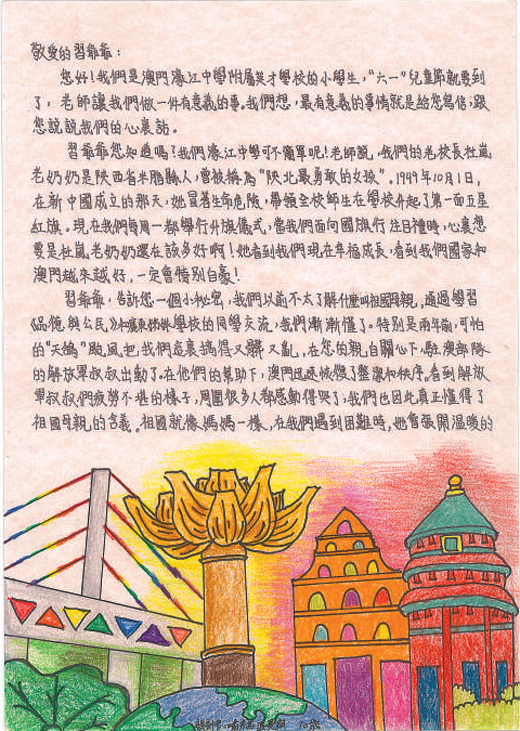 濠江中學創建于1932年,以愛國愛澳、為社會培育人才為辦學宗旨,是澳門中小學生人數最多的學校。該校素有愛國主義傳統,1949年10月1日新中國剛剛成立,時任校長杜嵐就帶領學校師生升起了第一面五星紅旗。近日,濠江中學附屬英才學校的小學生給習主席寫信,講述了他們對“祖國母親”含義的理解,表達了長大后把祖國和澳門建設得更美好的決心。