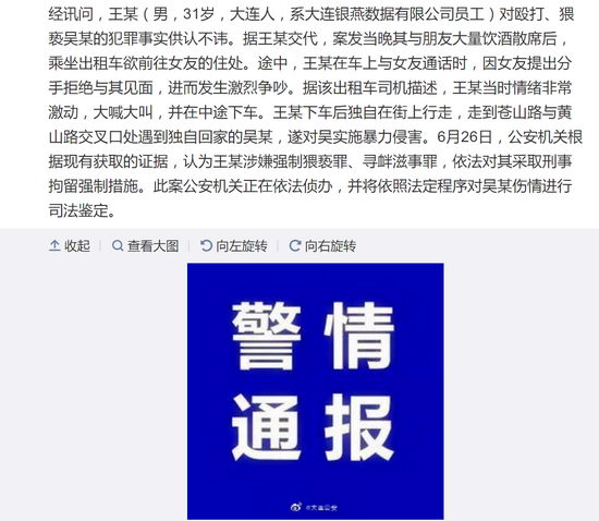 經(jīng)訊問(wèn),王某(男,31歲,大連人,系大連銀燕數(shù)據(jù)有限公司員工)對(duì)毆打、猥褻吳某的犯罪事實(shí)供認(rèn)不諱。據(jù)王某交代,案發(fā)當(dāng)晚其與朋友大量飲酒散席后,乘坐出租車欲前往女友的住處。途中,王某在車上與女友通話時(shí),因女友提出分手拒絕與其見(jiàn)面,進(jìn)而發(fā)生激烈爭(zhēng)吵。據(jù)該出租車司機(jī)描述,王某當(dāng)時(shí)情緒非常激動(dòng),大喊大叫,并在中途下車。王某下車后獨(dú)自在街上行走,走到蒼山路與黃山路交叉口處遇到獨(dú)自回家的吳某,遂對(duì)吳實(shí)施暴力侵害。6月26日,公安機(jī)關(guān)根據(jù)現(xiàn)有獲取的證據(jù),認(rèn)為王某涉嫌強(qiáng)制猥褻罪、尋釁滋事罪,依法對(duì)其采取刑事拘留強(qiáng)制措施。此案公安機(jī)關(guān)正在依法偵辦,并將依照法定程序?qū)悄硞檫M(jìn)行司法鑒定。