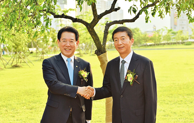 駱惠寧與全羅南道知事金瑛祿共同種植友誼之樹。 孫景凡 攝
