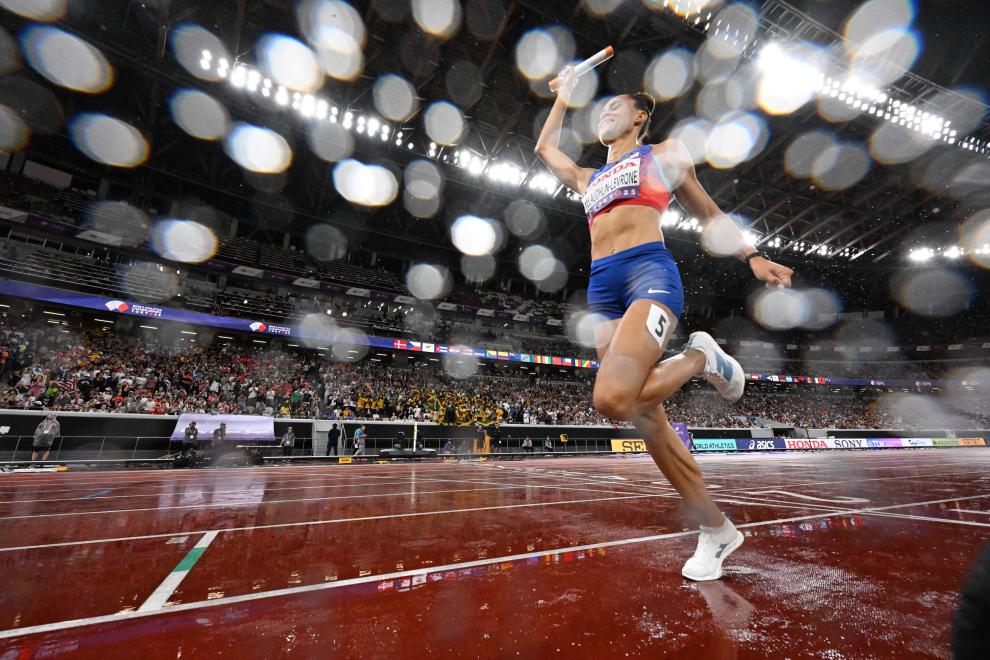 9月21日,2025年世界田徑錦標賽女子4x400米接力決賽在日本東京舉行,圖為美國隊第四棒選手麥克勞林在賽后慶祝奪冠。新華社發(呂小煒攝)