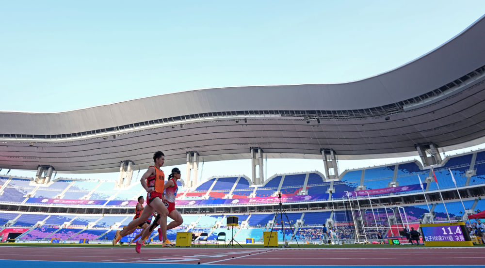 當日,伴隨著提振人心的醒獅表演,田徑、聾人籃球等項目都在簡短的開賽儀式后進入競賽環節。在廣東省奧體中心體育場舉行的田徑比賽傳來捷報,巴黎殘奧會兩銀得主、山東選手郭芊芊在女子400米T35級比賽中,以超世界紀錄、破全國紀錄的1分14秒65率先沖線。兩屆殘奧會冠軍、陜西隊的董飛霞在女子鉛球F55級比賽中摘下桂冠。在她的鼓勵下,陜西隊當天一共獲得6枚田徑金牌。