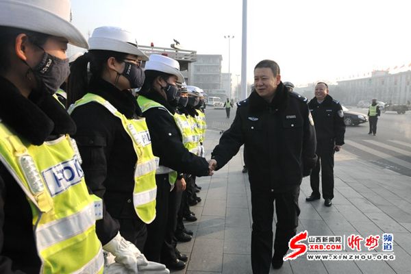 在交警七一崗,楊梅喜與執勤交警同志們一一握手,表達了新年祝福。他指出,交警同志們長期戰斗在大街小巷,夏頂酷暑、冬冒嚴寒,為創建平安忻州、為促進忻州公安上臺階、為道路平安暢通作出了重要貢獻,尤其是在霧霾天氣下,以犧牲身體健康為代價疏堵保暢,為市民出行創造了平安、暢通的交通環境,受到了黨委政府和人民群眾的一致認可,他代表市局黨委對交警同志們的可貴精神表達了崇高敬意。同時祝愿大家在新的一年里身體健康、工作順利,為創造平安暢通的交通環境作出新貢獻。