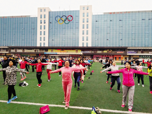 據了解,第九套廣播體操比以往第八套廣播體操更具有觀賞性和實用性,動作變化多,音樂節奏快,適合各類人群的鍛煉,并具有規范性、科學性、普遍性等特點,突出了“健康、歡樂、時尚”的風格。經過培訓的學員將成為我市推廣、普及第九套廣播體操的骨干力量。圖為學員們精神抖擻做廣播體操(張志遠 王菲)