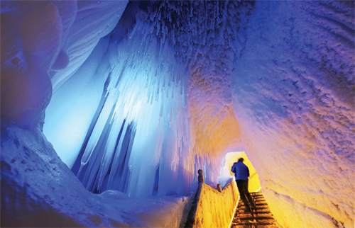 萬年冰洞深100多米,一年四季洞內溫度在零下4攝氏度到零下10攝氏度,寒冷無比,積冰常年不化,與洞外形成截然不同的兩個世界。當洞外鳥語花香之時,洞內卻依然寒氣逼人。在洞內冰筍、冰柱、冰錐、冰葡萄等千姿百態,形狀各異的美景奇觀隨處可見。