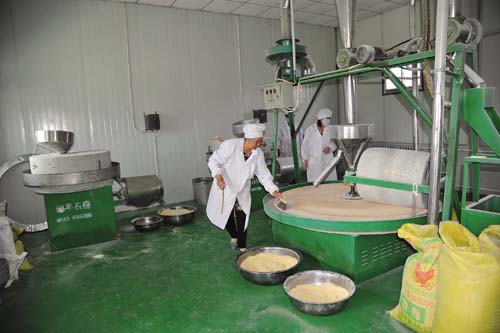 代縣景坤大地貿易有限公司于去年6 月份開始用石碾石磨加工生產小麥面粉、黃米面粉、小米和小雜糧調理面粉等。由于所加工生產的糧食均經過篩選、清洗、甩干,再加之精碾細磨、綠色有機、營養豐富、原汁原味,不添加任何添加劑,深受大城市市民的歡迎,供不應求,成為搶手貨。現已銷往北京、太原等地。(石俊文 劉睿 攝影報道)