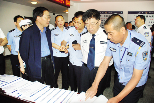 參加現場會的副市長武憲堂、省公安廳交管局局長賈繼武、市公安局副局長、交警支隊長袁小波等領導,在偏關縣公安局交警大隊觀摩(張軍 攝)