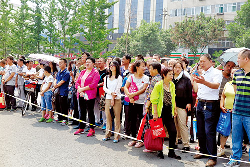 6月20日上午11時第一場考試結束,中考生們走出考場 考場外,烈日炎炎,來自四面八方的考生家長們在樹蔭下、街道旁或靜靜地等候,或相互交流有關孩子們的話題,其緊張的心情,一點也不亞于考場內正在考試的考生們。考點處,各愛心團體、商家搭亭設點,向考生和家長們免費贈送礦泉水、降暑飲料、學習資料,還有專車等待免費接送考生。也有不少教育培訓機構和學校組織人員向家長們發放資料,推介各自的教育特色和辦學水平。交警們堅守崗位,在烈日下疏導交通,各考點周邊交通環境秩序井然。