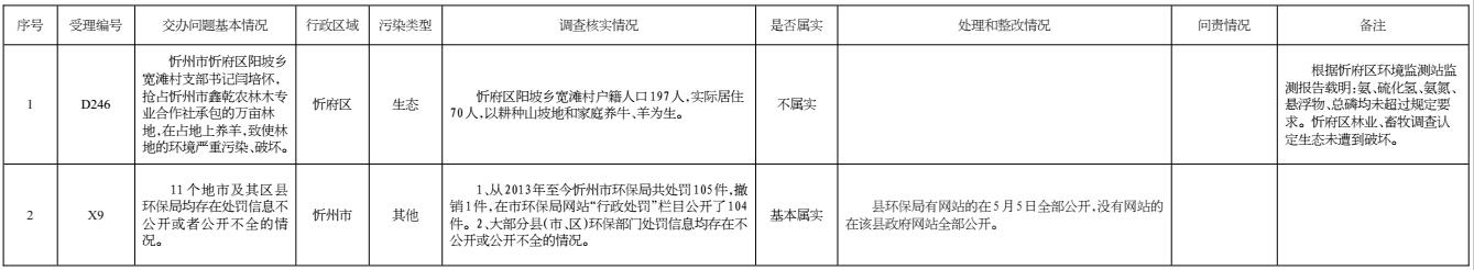 2017年5月2日晚,收到省群眾反映問題處置組督辦的第四批群眾反映問題共計2件。其中重點案件1件。我市高度重視,立即組織查處,截至5月5日,督辦的2件群眾反映問題已辦結。其中,確認基本屬實1件、不屬實1件。對于環保部門存在處罰信息不公開或者公開不全的情況,各縣(市、區)已于2017年5月5日前全部在政府網站或環保部門網站進行了公開;對2件群眾反應問題調查處理情況進行了信息公開。 忻州市第四批邊督邊改及公開情況統計表(截至5月5日)