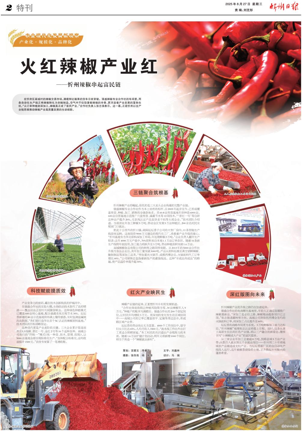 在忻府區高城村的辣椒交易市場,滿載鮮紅椒果的貨車日夜穿梭。強盛辣椒專業合作社的車間里,兩條自動化生產線正將辣椒轉化為剁椒制品,空氣中不僅彌漫著辣椒的辛香,更洋溢著產業發展的蓬勃生機。“從訂單種植到深加工,辣椒真正成了富民產業。”合作社負責人張志強表示。這一幕,正是忻州以全產業鏈思維推動辣椒產業高質量發展的生動縮影。