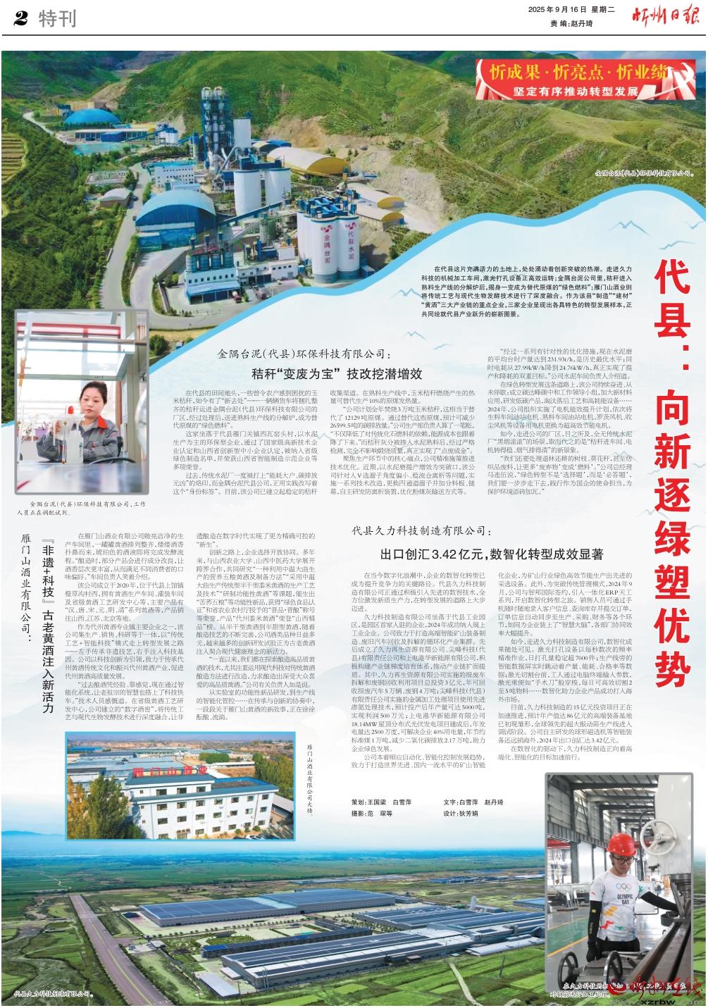 在代縣這片充滿活力的土地上,處處涌動(dòng)著創(chuàng)新突破的熱潮。走進(jìn)久力科技的機(jī)械加工車(chē)間,激光打孔設(shè)備正高效運(yùn)轉(zhuǎn);金隅臺(tái)泥公司里,秸稈進(jìn)入熟料生產(chǎn)線的分解爐后,搖身一變成為替代原煤的“綠色燃料”;雁門(mén)山酒業(yè)則將傳統(tǒng)工藝與現(xiàn)代生物發(fā)酵技術(shù)進(jìn)行了深度融合。作為該縣“制造”“建材”“黃酒”三大產(chǎn)業(yè)鏈的重點(diǎn)企業(yè),三家企業(yè)呈現(xiàn)出各具特色的轉(zhuǎn)型發(fā)展樣本,正共同繪就代縣產(chǎn)業(yè)躍升的嶄新圖景。