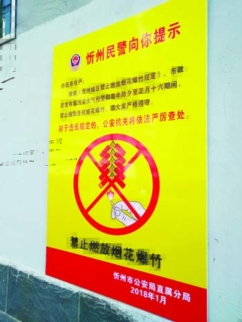 近日,細心的市民一定會注意到,各居民小區都張貼了春節期間禁止燃放煙花爆竹的民警提示。作為城市的一員,廣大市民一定要遵守《忻州城區禁止燃放煙花爆竹規定》,令行禁止,以實際行動保衛城區來之不易的良好大氣環境,過一個文明的春節。(魯明強 攝)