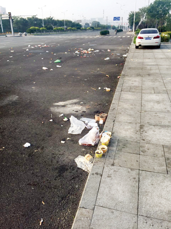 城區高鐵廣場前,慕山路與雁門大道丁字路口,每天晚上有小商販在此經營,本無可厚非,但每天產生的垃圾,既影響市容環境,還給環衛工人增加了工作量,呼吁市民及小商販愛護環境,也希望相關部門管理維護公共環境。一網友攝于8月22日