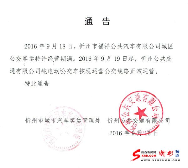 2016年9月18日,忻州市福祥公共汽車(chē)有限公司城區(qū)公交客運(yùn)特許經(jīng)營(yíng)期滿(mǎn)。2016年9月19日起,忻州公共交通有限公司純電動(dòng)公交車(chē)按現(xiàn)運(yùn)營(yíng)公交線(xiàn)路正常運(yùn)營(yíng)。