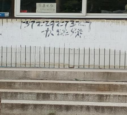 忻州市委黨校巷圣元奶粉對面墻上的違法辦證廣告(劉曉英 攝)