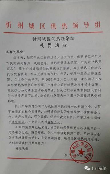 在上個供熱期間,從2016年2月2日開始,承擔城區80%集中供熱熱源供應的忻州廣宇煤電公司連續兩次發生設備故障,雖然熱力公司緊急啟動備用熱源,但是仍然導致集中供熱大管網供熱質量嚴重不達標,造成供熱范圍內一半用戶的采暖用熱受到影響。為嚴格要求,強化管理,經城區供熱領導組研究,決定對忻州廣宇煤電公司給予通報批評,并處罰金人民幣壹佰萬元。城區供熱領導組指出,忻州廣宇煤電公司作為城區集中供熱唯一的熱源企業,必須要有高度的社會責任感,加強設施設備的檢修維護,確保安全運行。