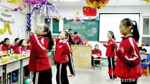 聯歡會由各班學生自己精心組織、排練,并由學生自主開展。同學們熱情高漲,積極參與,充分發揮自己的特長,表演自己最拿手的節目。每位同學都積極參與,每個人都成了“明星大腕”。班級聯歡會內容豐富、精彩紛呈,舞蹈、歌曲、相聲、小品、游戲等節目一一亮相,喜慶祥和的氛圍濃厚強烈。圖為初二210班學生正在進行節目表演。(郝江峰 攝)