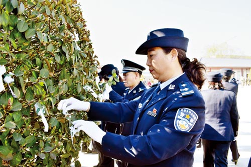 在烈士紀念碑前,大家重溫了入黨誓詞,許下莊嚴神圣的諾言,向革命烈士紀念碑敬獻花圈,集體脫帽低頭默哀,緬懷革命先烈勇于拼搏、甘于奉獻的崇高品質。民警們參觀了烈士紀念碑,了解烈士事跡,并紛紛將胸前的小白花掛到了紀念碑旁邊的樹上,表示要牢記人民警察的神圣誓言和莊嚴使命,踐行“忠誠、為民、公正、奉獻”的人民警察核心價值觀,傳承革命烈士的精神和情懷,履行好維護社會和諧穩定的職責,以飽滿的熱情和昂揚的斗志為公安事業貢獻自己的全部力量。(魯明強 劉慧云)