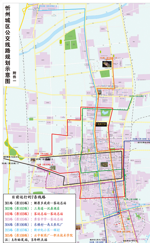 途經站點:解原鄉政府→佐城村口→流江村口→新路村口→供熱公司→燕山加油站→田家炳中學→逯家莊村口→武警支隊→寧靜大廈→廣電大樓→忻州六中→日月廣場→忻州市人民政府→君華新天地購物廣場→洗滌化妝品→火車站→云中路小學→和平廣場→市人民銀行→忻州師院→建設路口→忻州市供水公司→客運總站(北),共24個站點。