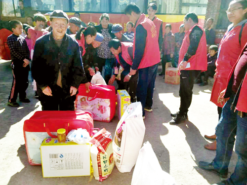 深秋的早晨伴著涼風,空氣中帶著絲絲冷意,志愿者們乘坐的中巴車緩緩地駛入蘆草溝村。中巴車還沒停穩,在村口曬太陽的村民就都圍了過來。當村民們得知志愿者的來意后,非常感謝志愿者的愛心幫助。此時大家一鼓作氣將車上帶來的慰問品搬了下來,分類后開始分發。本次活動主要探望的是該村的13戶孤寡老人,慰問物品包括每人一桶油、一袋面、一袋米以及食鹽、醬油、醋等生活必需品。志愿者還為當地的兒童準備了新書包以及防寒過冬的衣服。經過一個小時的忙碌,慰問品分發完畢。