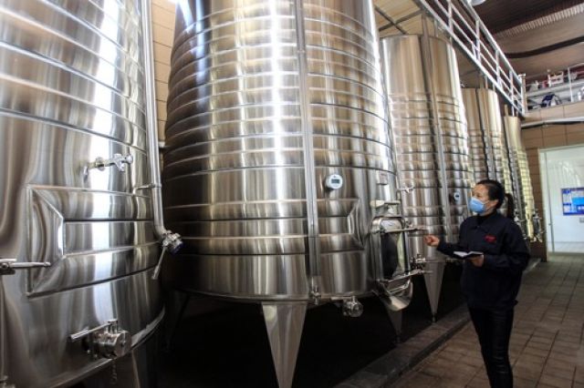 在寧夏永寧縣閩寧鎮立蘭酒莊,劉莉在檢查紅酒發酵罐的溫度(2017年12月22日攝)。新華社記者 隋先凱 攝