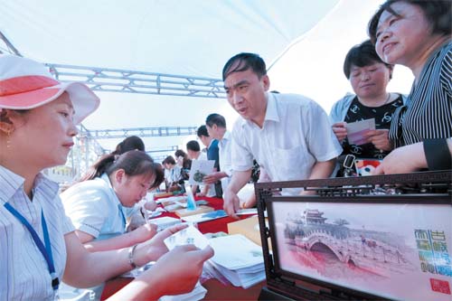5 月19 日,集郵愛好者在河北省邯鄲市永年區廣府古城購買《中國古鎮(三)》特種郵票。新華社發(郝群英攝)