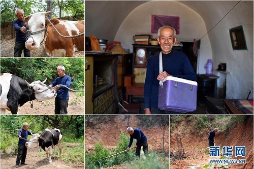 曹晉忠,男,1949年出生,山西省長治市武鄉(xiāng)縣鋪上村人。曹晉忠是村里的動物防疫員,自己種了4畝玉米、2畝小米。因為妻子常年臥病在床,曹晉忠一家是該村的精準扶貧對象。曹晉忠說,醫(yī)護人員經(jīng)常上門進行健康狀況隨訪,駐村工作隊也常來家里幫忙,現(xiàn)在看病不發(fā)愁,干活有人幫,生活挺好的。 右上:曹晉忠肖像;左上、左中、左下:曹晉忠在給村里的牛做檢查;下中、下右:曹晉忠在地里干農活(拼版照片,6月12日攝)。 地處晉東南的山西省長治市,位于由太行山、太岳山環(huán)繞而成的上黨盆地中。在群山中、崖壁上,許多村莊自然條件惡劣,基礎設施落后,脫貧致富是大山深處人們的迫切心愿。 近年來,一場場脫貧攻堅戰(zhàn),在一個個深山村打響。政府全力探索脫貧路徑的同時,山區(qū)百姓因地制宜,靠自己的雙手和智慧走上致富路,交出了一份扎實的脫貧答卷。 記者在太行山、太岳山一路尋訪,記錄下多位70歲老人的生活。這些共和國的同齡人,親歷了山鄉(xiāng)的巨變,見證著長治山區(qū)脫貧攻堅偉大工程的一步步推進。 新華社記者 詹彥 攝