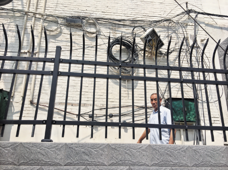記者在位于該路口的市化工局宿舍樓側面墻上看到布滿“蛛網”般的電線,藕斷絲連,錯綜復雜。小區住戶劉大爺告訴記者,這堵墻上的電線種類繁多復雜,最要緊的是其中的高壓電線固定在距離地面只有1米至1.5米左右的墻上,電線外面的PVC保護管已經因年久失修嚴重老化,電線直接裸露在外,遇上下雨打雷天氣非常危險,平時小孩玩耍路過也不安全。據記者觀察,在距離這堵墻約兩米的地方有1根電線桿,宿舍樓墻上離地面最近的4根黑色電線就是從這根電桿上接進來的,電線橫搭部分基本暴露在外,特別不安全。小區居民希望相關部門能夠盡快消除隱患,給居民們一個安全放心的居住環境。