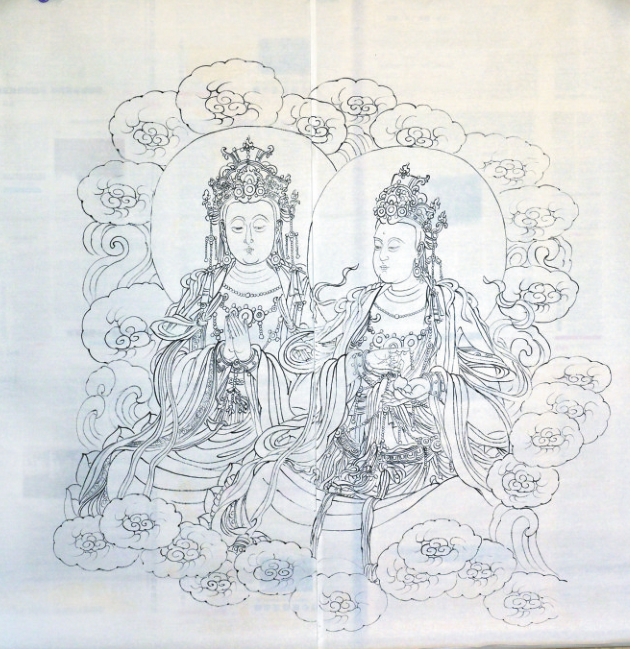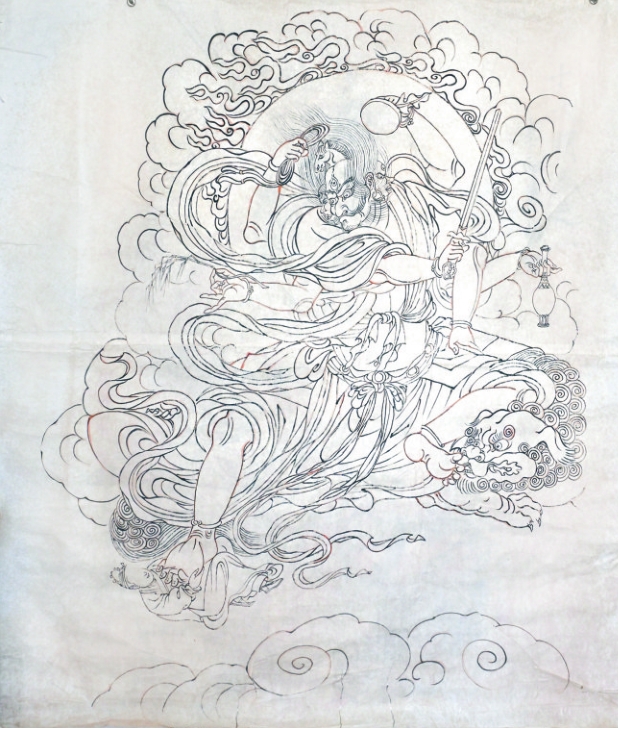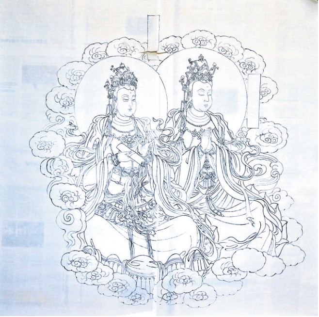 在李向東看來,臨寫是為了學習而不是“復制”壁畫。面對殘破或年久漫漶不清的畫面,他從蛛絲馬跡入手反復揣摩,根據壁畫整體的線描、造型特點,一一補而畫之,最后定稿。從這個意義上說,李向東也使殘破的公主寺壁畫得以復原,“補壁”之功不可小覷。