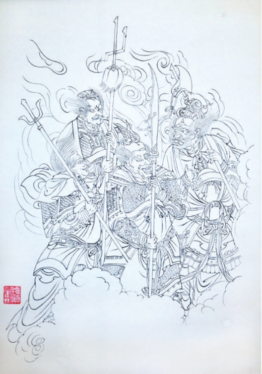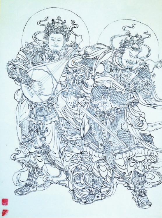 更令李向東醉心不已的是,壁畫中人物衣袖明明是靜態,卻似乎被微風吹動、卷起形成鼓動之勢,仿佛下一秒就要隨風起舞。在靜止的壁畫中,畫師勾勒出搖動的扇面、飛舞的發絲,以及在眾仙家之間縹緲虛幻的云海,創造了靈動出畫的動態美。眾神佛道三五成群,看似錯落隔離,卻又遙相呼應,彼此相望,顧盼生輝,呼之欲出。在人物群像中,李向東對金剛座神的畫法最為推崇——面目粗獷,體格魁偉,毛發濃密,一雙銅鈴般的眼睛微微斜視,須眉怒張,威風凜凜。身體重心偏向一側,一手持金剛杵于肩頭,一手探掌護于胸前,全身肌肉緊繃,顯示出畫師對線條的熟練運用和高超的造型能力。