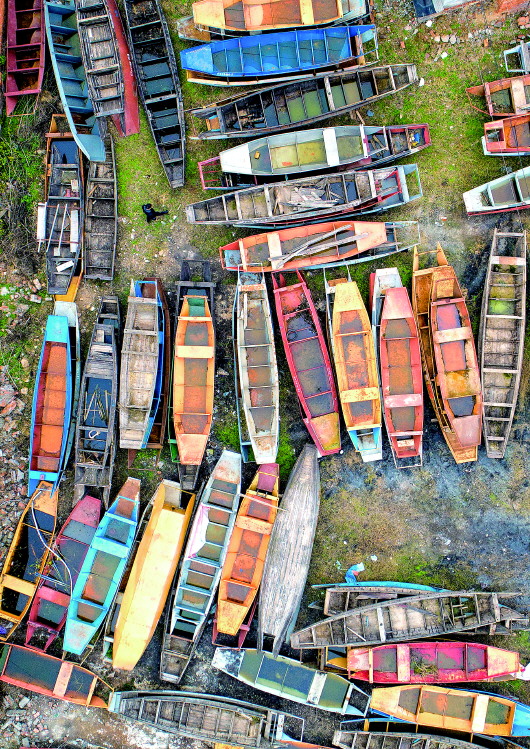 ▲湖北省宜都市枝城鎮白水港村一處“上岸”的漁船堆放點(無人機照片),這些收回的漁船將被集中拆解(2020年1月2日攝)。
