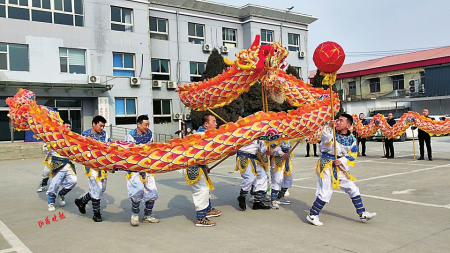 “咚咚鏘、咚咚鏘、咚鏘咚鏘咚咚鏘……”2月22日,在太原市小店區北格鎮東蒲村黨群服務中心,舞龍表演隊員身著色彩鮮艷的表演服裝,腰間系著黃藍相間綢帶,隨著鼓樂的響起,隊員們高舉祥龍隨著龍珠奔跑。只見兩條龍時而上下翻騰、左右盤旋,時而倒地平舞、蜿蜒遨游,隊員們配合默契,有節奏地舞動著長龍,造型栩栩如生,吸引了眾多村民提前感受元宵節的氛圍。